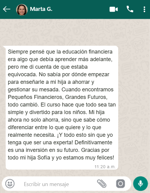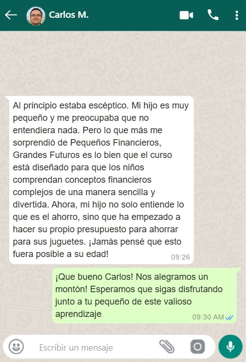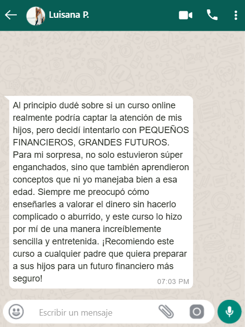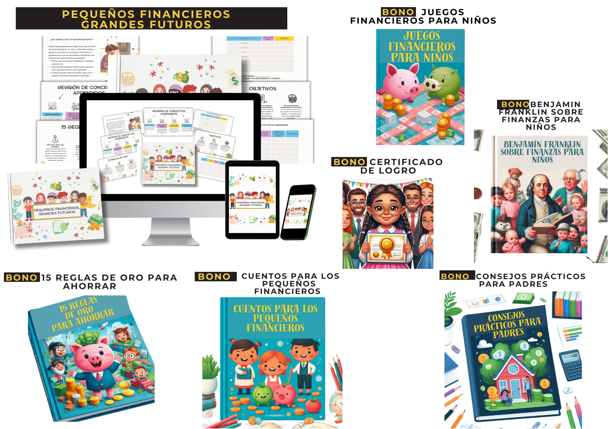 Estamos tan seguros de que «Pequeños Financieros, Grandes Futuros» será una herramienta clave en la educación de tus hijos, que respaldamos tu compra con nuestra garantía de satisfacción. A través de este curso, tus pequeños se embarcarán en un viaje divertido y educativo, donde aprenderán los conceptos básicos del ahorro, la planificación financiera y la toma de decisiones responsables. Los beneficios son claros: desde la creación de hábitos financieros saludables hasta el desarrollo de habilidades que les servirán para toda la vida.