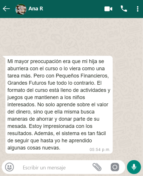 Otra gran diferencia es la participación activa de los padres, a quienes se les ofrecen herramientas y consejos prácticos para reforzar lo aprendido en casa, lo que potencia el impacto del curso en la vida diaria de los pequeños. Además, el curso incluye materiales descargables, como diarios de ahorro y planificadores de metas, y certificados de logro que reconocen sus avances, incentivándolos a seguir adelante con sus metas financieras.